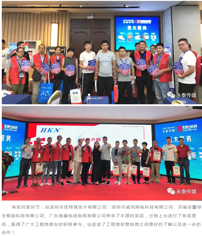 2019年8月16日,2019中國安防工程商(系統(tǒng)集成商)大會暨第三十二屆中國安防新產(chǎn)品、新技術(shù)成果展示會在鄭州銀河國際酒店順利召開。 大會第一天,會議由鄭州市公共安全防范行業(yè)協(xié)會理事長程華女士,永泰傳媒總經(jīng)理王海泳先生先后致辭。 大會第二天,全國安防專家、廣西公安廳高級工程師 張凡夫先生帶來“智慧應(yīng)用是公共安全視頻大數(shù)據(jù)發(fā)展的方向”主旨演講。廣東�?惦娋電纜有限公司 的贊助商代表也帶來了精彩演講。 本次大會贊助商與工程商進行了大量交流,溝通,互動,增進了彼此的了解,堅定了合作的信心,為雙方交易達(dá)成起到了關(guān)鍵性的作用。永泰傳媒作為本次大會的主辦方,精心設(shè)計了多項抽獎活動,將本次大會推進了高潮! 2019年8月17日,2019中國安防工程商(系統(tǒng)集成商)大會暨第三十二屆中國安防新產(chǎn)品、新技術(shù)成果展示會在鄭州銀河國際酒店圓滿落幕!